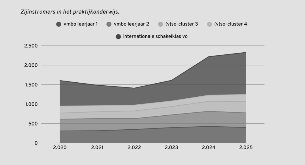 Er zijn steeds meer jongeren die praktijkonderwijs volgen: dit schooljaar is voor het eerst de grens van 30.000 leerlingen gepasseerd. De groei komt onder meer door het grote aantal zij-instromers vanuit het vmbo of een (internationale) schakelklas. De raad schrijft de toename ook toe aan beleidskeuzes. Door wet- en regelgeving rondom de doorstroomtoets komen leerlingen vaak bij het hoogste advies uit. Leerlingen met een dubbel advies praktijkonderwijs/vmbo-basis komen zo vaak op het vmbo terecht. Maar niet alle leerlingen redden het daar. Als het niet goed gaat op het vmbo, stappen ze later alsnog over naar het praktijkonderwijs.